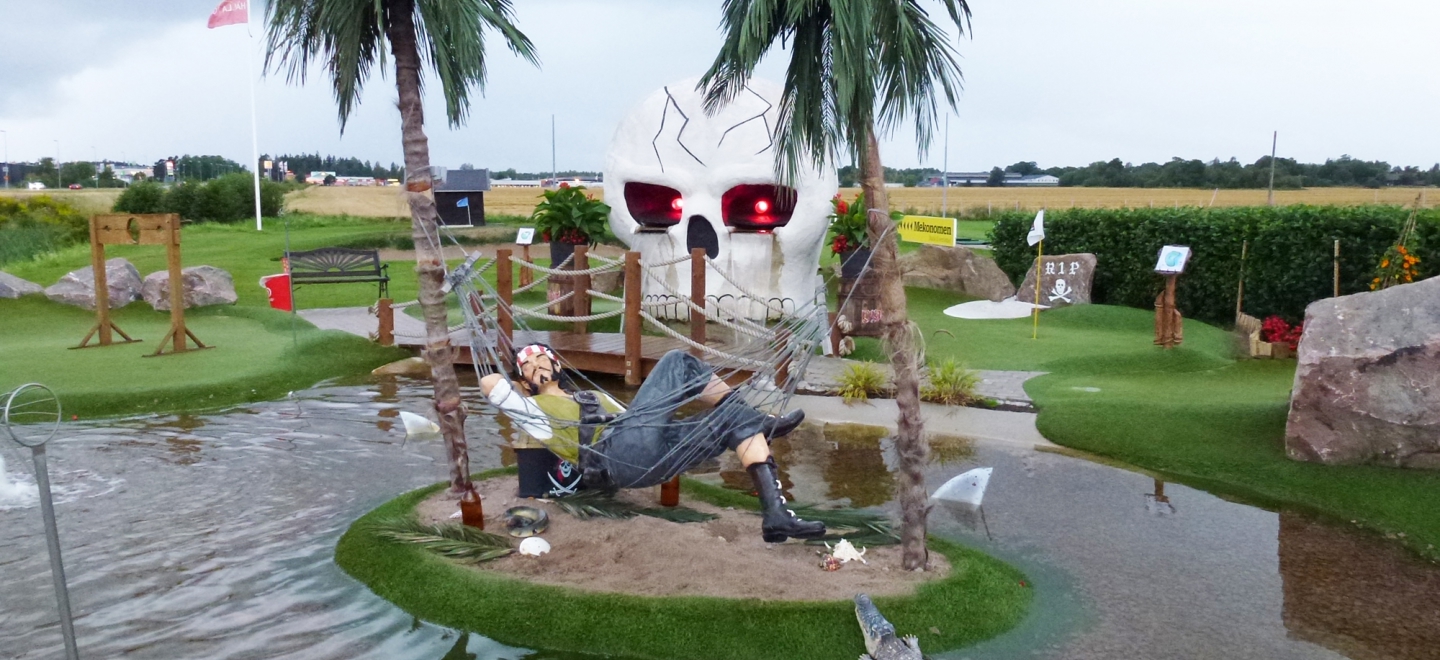 Här i Västerås fanns det tidigare ett tiotal vanliga minigolfbanor på filtmattor men de håller successivt på att bytas ut mot roligare varianter i takt med att fler hakar på äventyrstrenden. Piratgolfen är inne på sin fjärde säsong och lockar både barnkalas till gapskrattande kvinnor som slår sig fram på de tolv banorna, till exempel till ett utedass vars dörrar öppnas när bollen rullar under huset och visar ett skelett som sitter och uträttar sina behov. Men den dag som vi är här möter vi en man med sträng uppsyn som hyschar åt oss varje gång han ska slå. Han har uppenbarligen blandat ihop disciplinen som råder på en vanlig 18-hålsbana med den här lekfulla platsen.