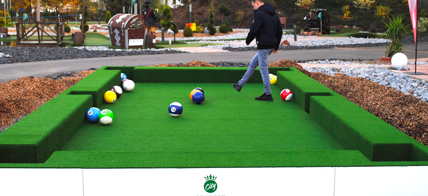 Fotbollsbiljard spelas på ett överdimensionerat biljardbord (4 m x 7 m) med specialsydda fotbollar som liknar riktiga billjardbollar. Setet innehålle sju bollar med färgade ränder, sju som är helt färgade, en svart nr 8 och en vit boll. För att spela behöver man inte vara en begåvad fotbollsspelare; Det handlar om taktik, noggrannhet och att ha roligt!